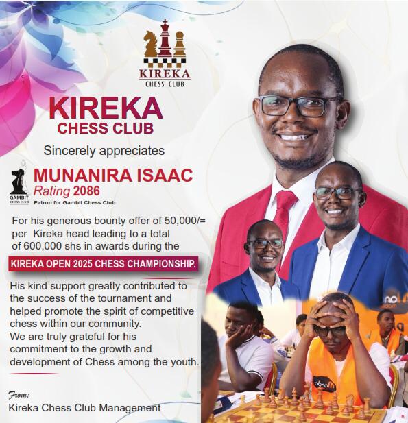 Special appreciation goes to Mr. Bob Were, patron of Kireka Chess Club, and the organizing committee led by Sanya Derrick and Kafuko John, for delivering a world, class event.
